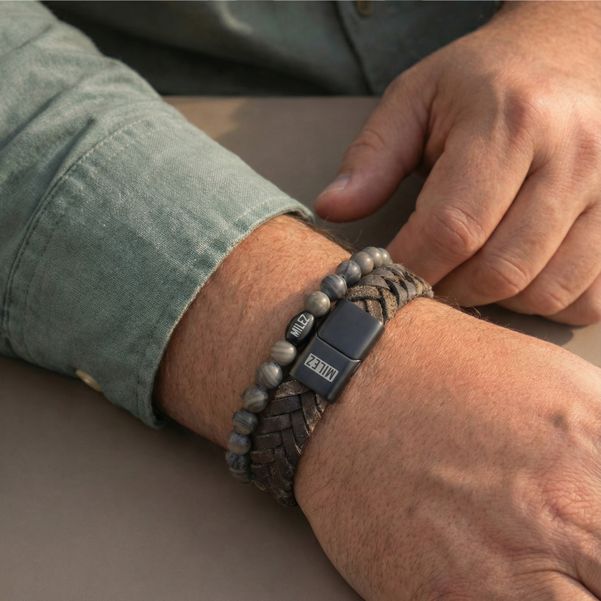 Ben je op zoek naar een stijlvolle mannen armband die perfect bij jouw look past? Bij Milez vind je een ruim assortiment herenarmbanden van leer en armbanden van natuursteen kralen. Al onze armbanden worden handgemaakt in Nederland, met oog voor detail en kwaliteit, en voor iedere polsmaat.