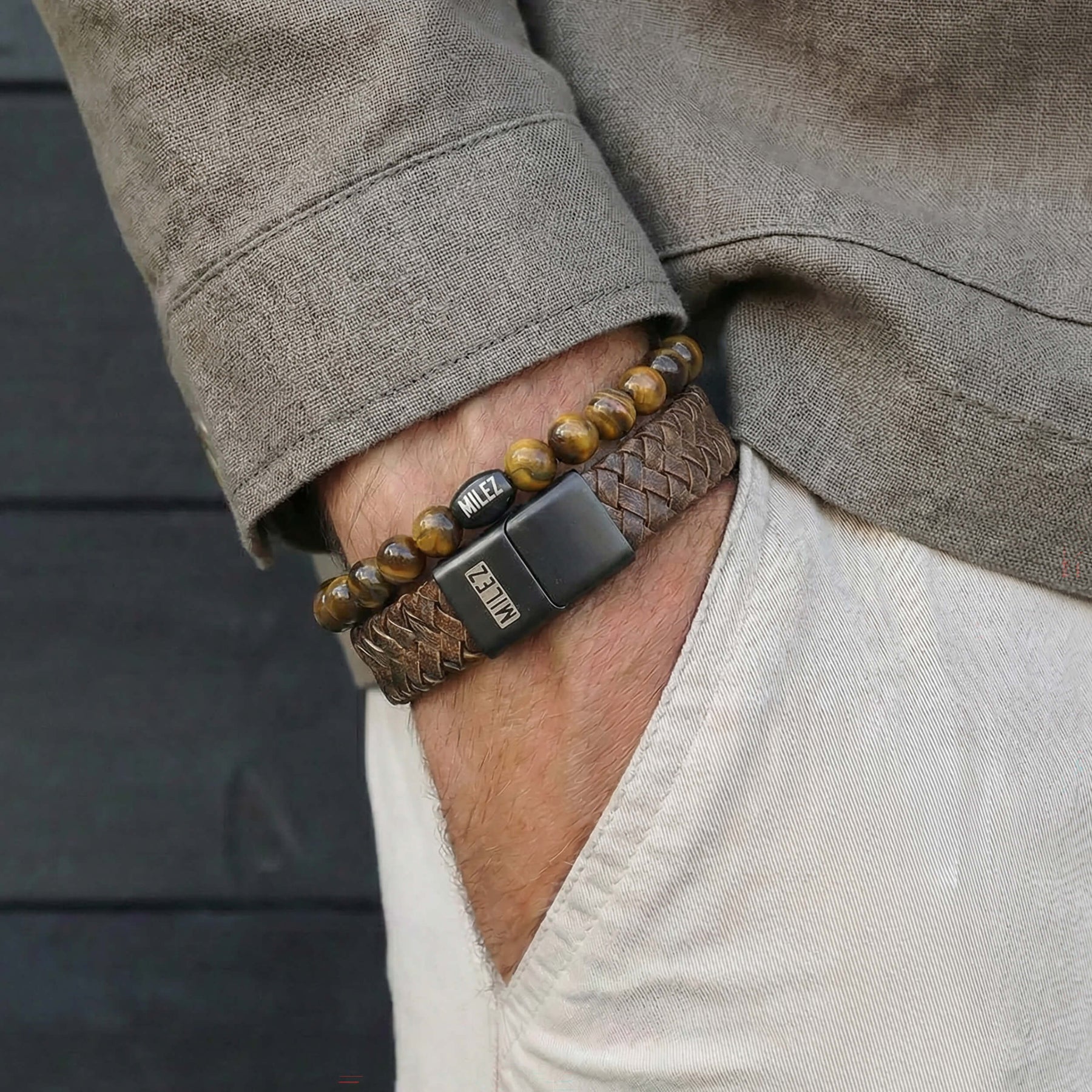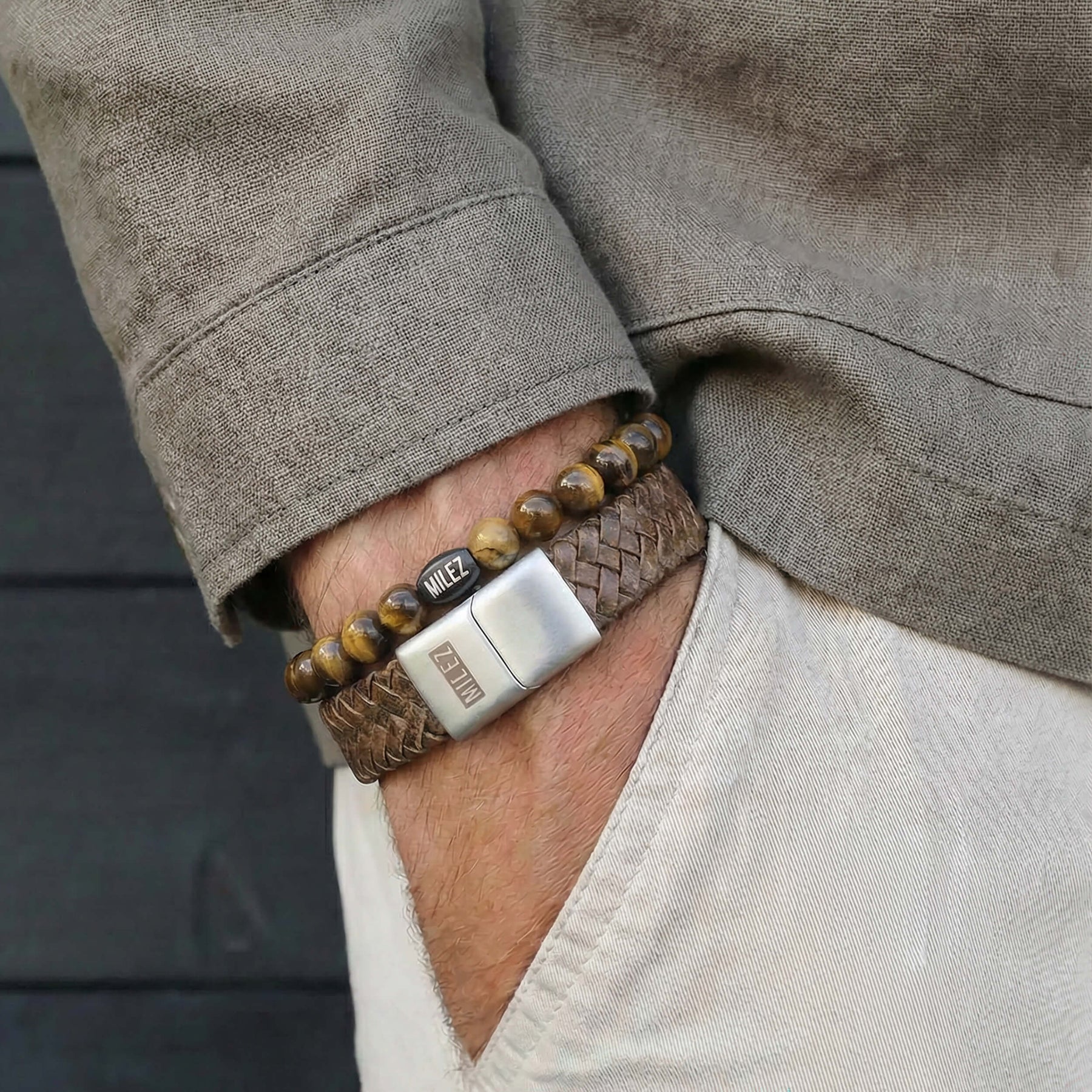 De bruine leren armband staat iedereen goed, terwijl de tijgeroog kralenarmband een bijzondere glans toevoegt. De bruin-gouden schakeringen in de kralen vangen het licht op een subtiele manier en geven je look meer diepte. Samen zorgen ze voor een combinatie die mannelijk, krachtig en tegelijk elegant is.