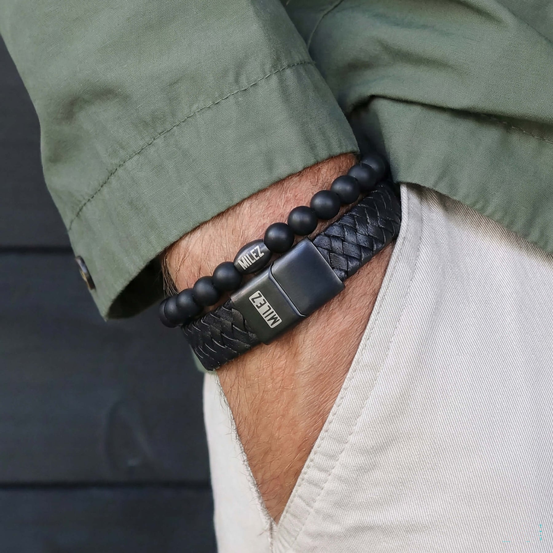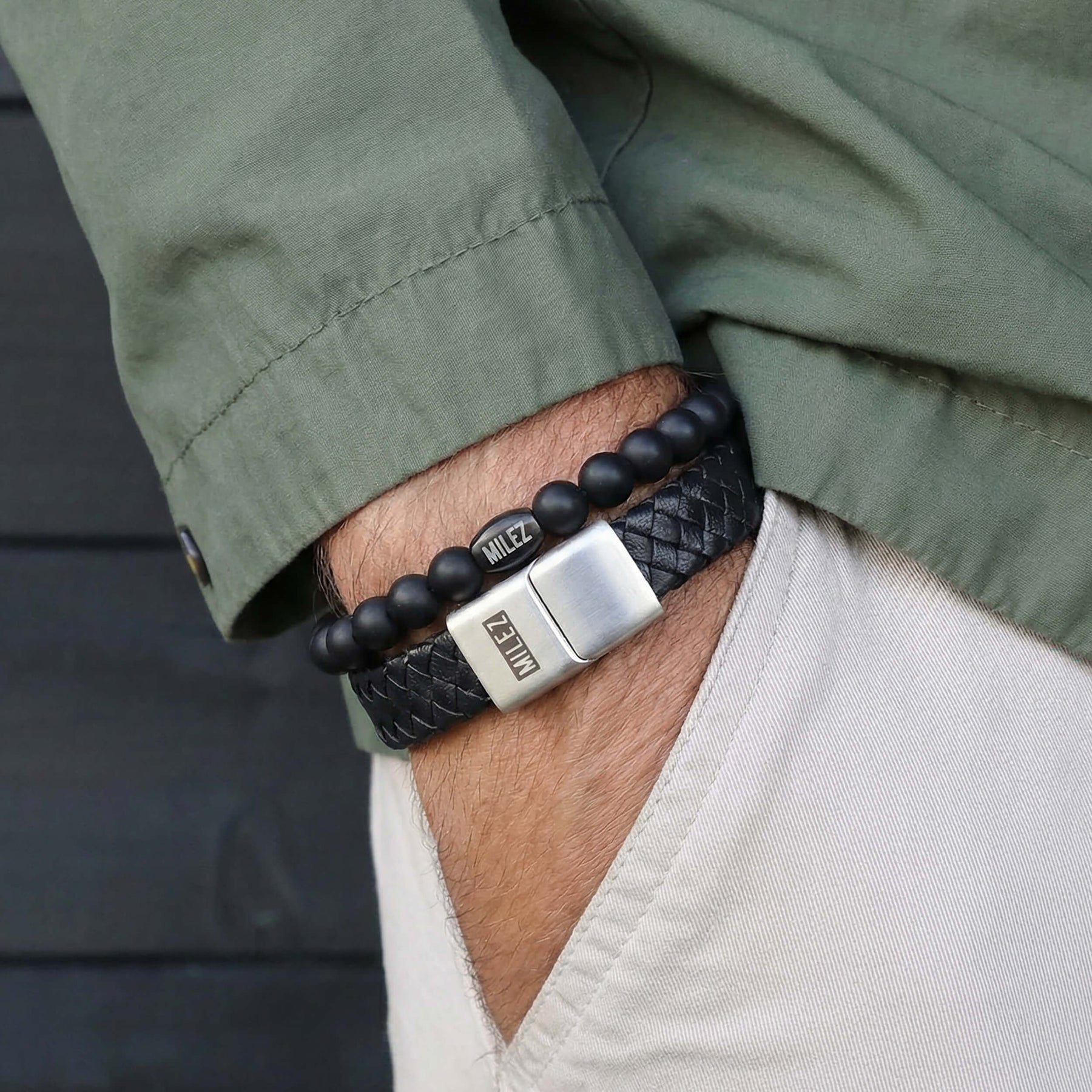 De leren armband is robuust uitgevoerd met een matte RVS sluiting, terwijl de kralenarmband de set net dat beetje extra diepte geeft. Samen vormen ze een tijdloze combinatie die past bij elke outfit – van casual tot zakelijk.