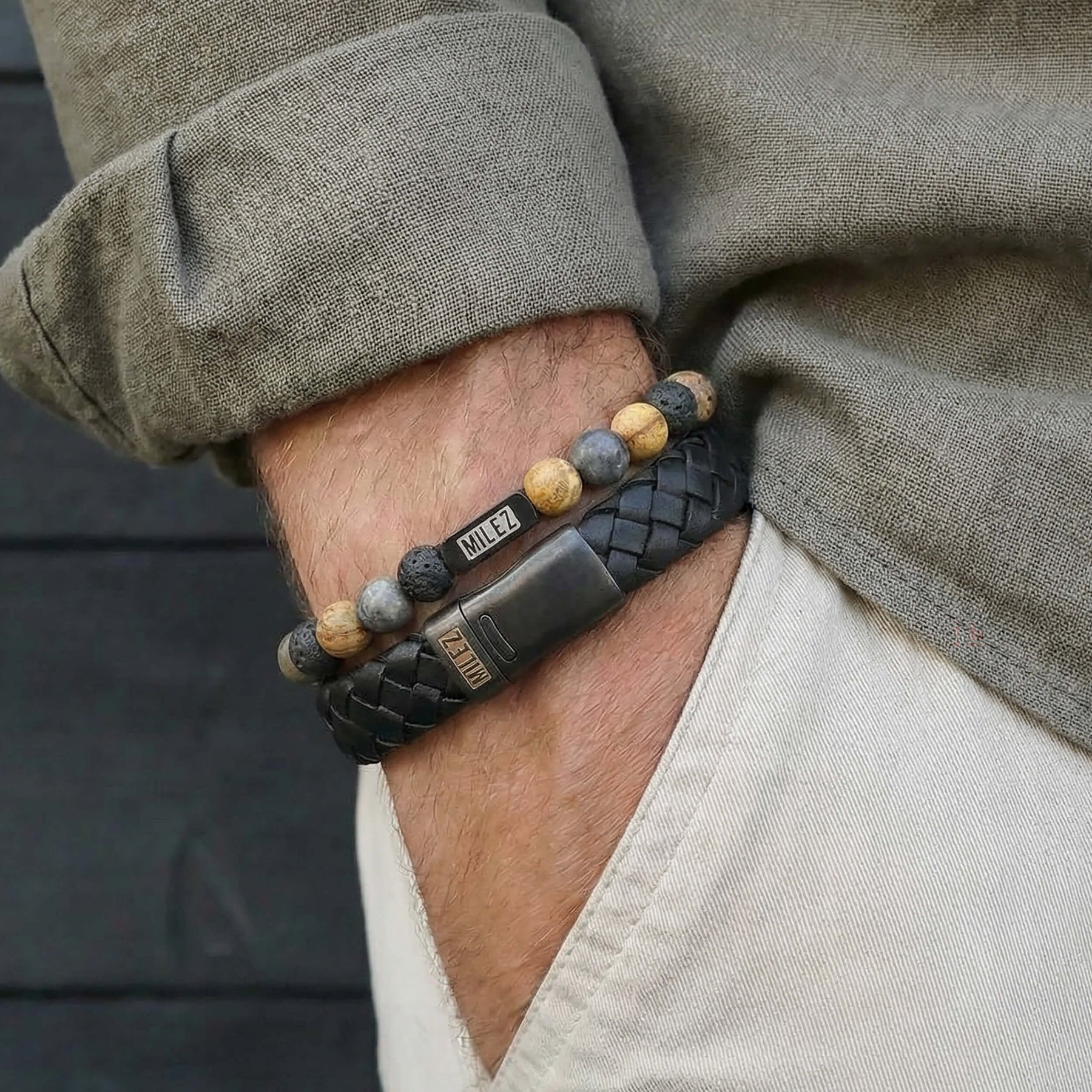 Je kunt deze mooie kralenarmband los dragen, maar hij is ook prachtig te combineren met een van onze leren heren armbanden.