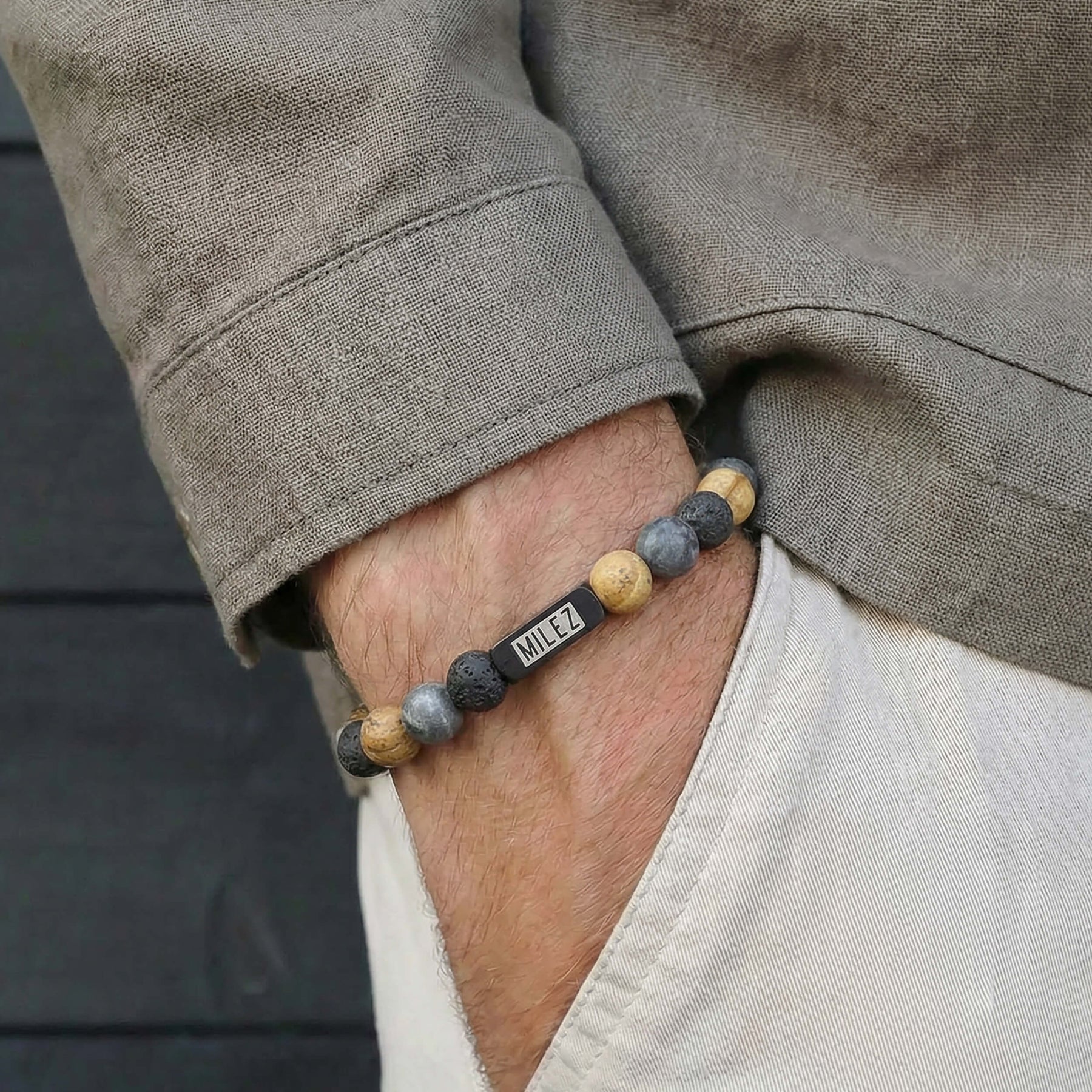Ruw, natuurlijk en vol karakter. Deze armband mixt houttinten met robuuste zwarte lavasteen en antracietkleurige kralen. De matzwarte RVS logokraal maakt het helemaal af. Een stoere combi met een natuurlijke vibe – perfect voor mannen die hun stijl graag dicht bij zichzelf houden. Draag ‘m los of met andere armbanden voor een nonchalante, krachtige look.