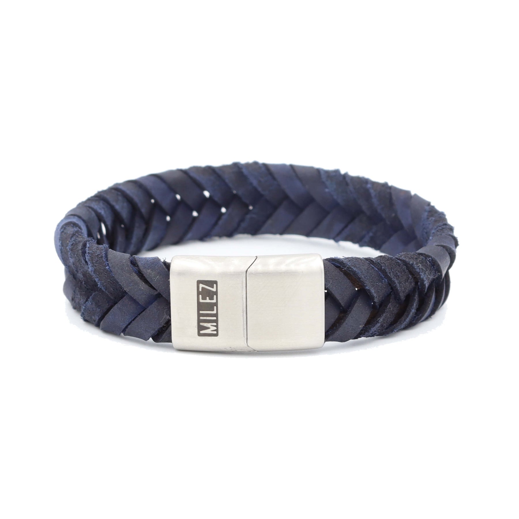 Deze 15 mm brede armband van diep donkerblauw leer is een statement van stijl en zelfvertrouwen. De brede vlecht is gemaakt van een unieke mix van glad en vintage leer, wat zorgt voor een rijke textuur en een intense uitstraling. In combinatie met de zilverkleurige RVS-sluiting straalt deze armband kracht, klasse en karakter uit.
